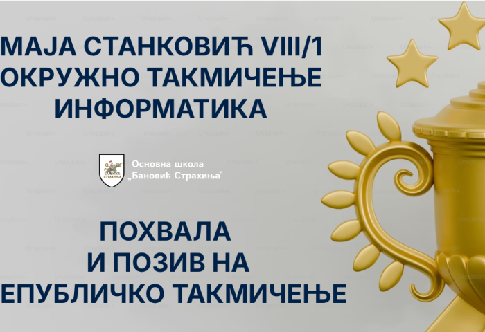 Ученица осмог разреда наше школе, Маја Станковић (VIII-1), учествовала је на окружном такмичењу из информатике и освојила похвалу и пролаз на републичко такмичење. Републичко такмичење ће се одржати 25. и 26. априла у Суботици. Честитамо Маји и желимо јој пуно успеха на предстојећем такмичењу!