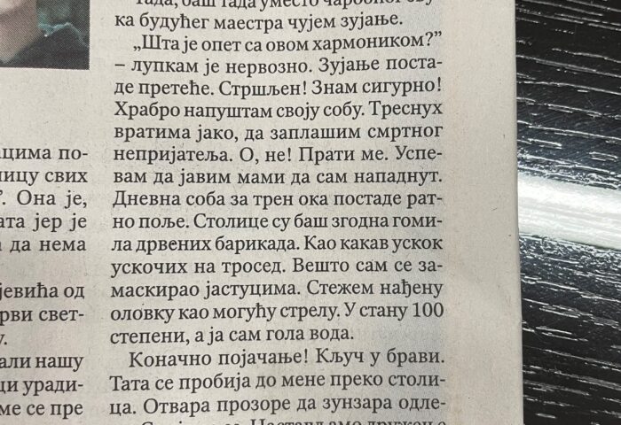 Писмени састав нашег ученика Станка Вићановића 5/1, објављен је у дневном листу ,,Политика” на Дан примирја у делу Политика за децу. Стршљен Обичан дан распуста. Родитељи су на послу, а ја сам код куће сам. Намештам хармонику да вежбам. Тада, баш тада уместо чаробног звука чујем зујање. „Шта је опет са овом хармоником?“, лупкам је […]