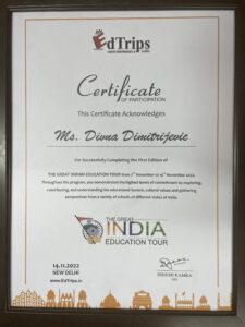 Дивна Димитријевић, професор историје, као члан делегације Annex_yu, коју чине најбољи наставници држава бивше Југославије, боравила је у Индији од 4. до 14. новембра ове године на студијском путовању The Great India Education Tour. На путовање је кренуло једанаест наставника из региона, међу њима је петоро из Србије, а Дивна Димитријевић је једини наставник из Београда који је присустовао конференцији.